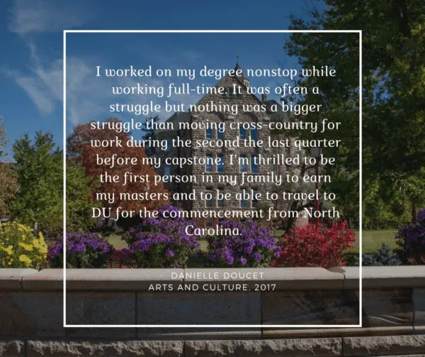 <em>I had been working full time in Arts Administration for six months when I started my master’s program. I worked on my degree nonstop while working full time and living on my own. It was often a struggle but nothing was a bigger struggle than moving cross country for work during the second the last quarter before my capstone. Amid medical issues and learning a new job and new city, I continued and was able to successfully complete my capstone. I’m thrilled to be the first person in my family to earn my masters and to be able to travel to DU for the commencement from North Carolina. </em>